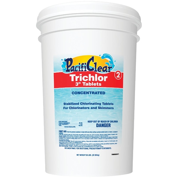 3 In. Trichlor chlorinating tablets are self stabilized with a built in stabilizer containing cyanuric acid which helps prevent sunlight from degrading the chlorine. 90% available chlorine is released when the product is dissolved in water and works continually to kill bacteria control algae and destroy the organic contaminants in water. Upon contact with chlorine bacteria and other contaminants are oxidized. Simplifies pool care with long lasting routine chlorination via convenient skimmer feeder or floater application. Gentle on pool equipment and surfaces. Ideal for all pool surfaces. Clears up hazy water and helps prevent future algae growth.