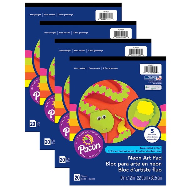 Heavyweight all-purpose construction paper in four Neon colors that are backed with fluorescent Yellow: Neon Red, Neon Pink, Neon Green and Neon Orange. Each sheet measures 9" x 12". Each pad includes 20 sheets. Sold as 4 pads for a total of 80 sheets.