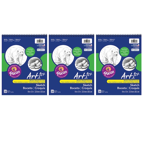 Lightweight White sulphite drawing paper spiral bound at the top. Perfect for classroom and field sketching. A general purpose sketch paper for all dry media. Acid-free and Recyclable. Measures 9" x 12". Each pack includes 30 sheets. Sold as a set of 3 packs, 90 sheets total.
