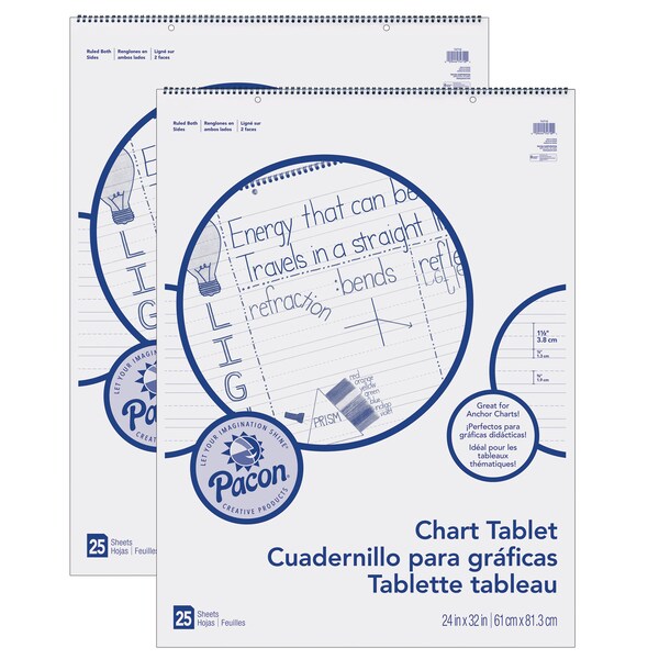 This Chart Tablet features White sulphite bond paper that is spiral bound to stiff covers with a Manuscript alphabet printed inside. It is 2-hole punched for easy hanging. Paper is ruled on both sides, and works well for classroom anchor charts, posters and other teaching aids. Ruling is 1-1/2" with 3/4" broken midline and 1/2" skip space. Measures 24" x 32". Each tablet includes 25 sheets. Sold as pack of 2 tablets.
