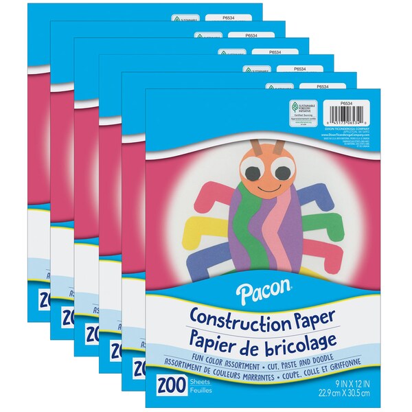 Lightweight construction paper assortment that is Ideal for cutting, pasting, doodling and drawing. A good quality construction paper perfect for young artists developing fine motor skills through art initiatives. Assorted colors. Recyclable. Measures 9" x 12". Each pack includes 200 sheets in assorted colors. Sold as 6 packs for a total of 1200 sheets.