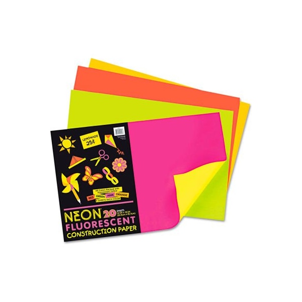 Pacon neon construction paper, 76 lbs., 12 x 18, assorted, 20 sheets/pack heavyweight all-purpose construction paper comes in four assorted fluorescent colors. Each sheet is backed with fluorescent yellow while the front side is either red, pink, green or orange. larger quantity quotes available. Please call 1-888-978-7759. this product arrives to most customers in 2-3 business days.