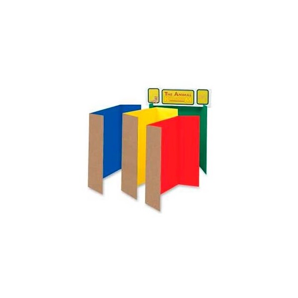 Pacon single walled presentation board, 48" x 36", assorted, 24/set tri-fold, single-walled corrugated display boards are used for projects, booths, science fairs and all types of displays. Each board is colored on the front and natural kraft on the back. Assortment includes equal numbers of red, green, yellow and blue. Boards are made with a high percentage of recycled material.