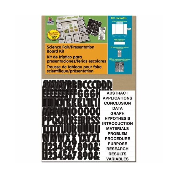 This convenient kit includes all the essential project materials needed for quickly creating a professional-looking display board. Kit includes one white corrugated, 48'' x 36'' presentation board, one white corrugated header, 143 self-adhesive and reusable black letters, numbers and symbols, and 14 self-adhesive science titles Abstract, Applications, Conclusion, Data, Graph, Hypothesis, Introduction, Materials, Problem, Procedure, Purpose, Research, Results and Variables.