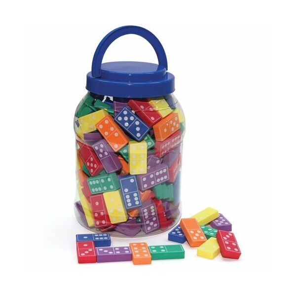 Soft, durable foam dominoes are 1-3/4'' wide and 3/8'' thick so they are easy to pick up and grasp. 168 pieces feature five different colors. They come with a reusable storage bucket that includes a screwtop and carry handle.