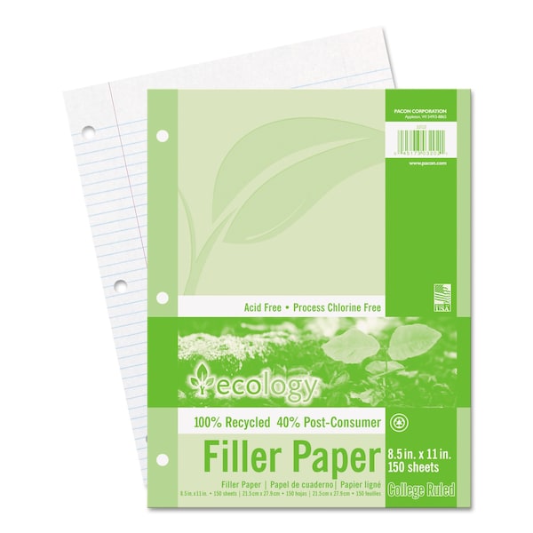 PaconĀ® Ecology Filler Paper, 3-Hole, 8.5 x 11, Medium/College Rule, 150/Pack