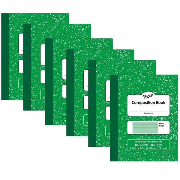 This Pacon Pastel Composition Book features green pastel colored pages with a coordinating colored cover and binding. Colored paper has been shown to increase memory and comprehension during note-taking and help students work through the impacts of various learning disabilities such as dyslexia and ADHD, as well as those with visual stress syndrome. Measures 9.75" x 7.5" size. 100 Sheets/200 Pages per book. Sold as a pack of 6 books.