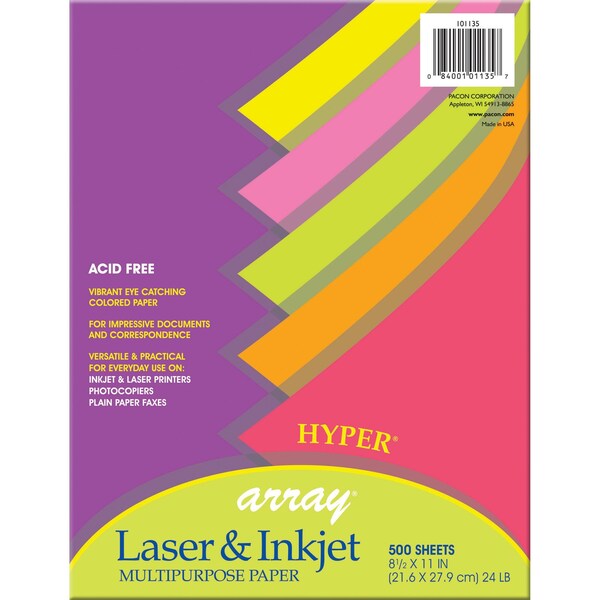 Vibrant colored paper perfect for documents you want to stand out among others. This 20 lb. paper works well in laser and inkjet printers, photocopiers and offset printers. Assorted five colors include: Hyper Yellow, Hyper Pink, Hyper Orange, Hyper Coral Red and Hyper Lime. Acid-free and recyclable. Each pack includes 500 sheets. Each sheet measures 8.5" x 11".