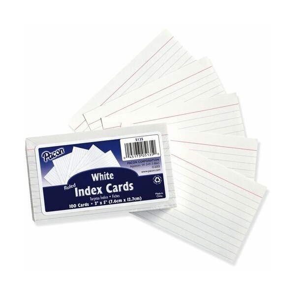 Index Cards, Ruled, 3inx5in, White, 100PK