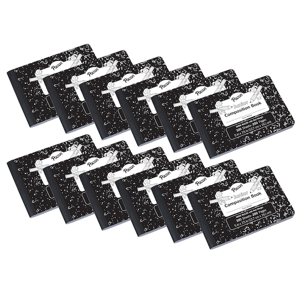The PaconĀ® Junior Composition Book is a 5" x 7-1/2" composition book that is great for students to use for daily grammar and vocabulary work, practicing math word problems or as a class journal. The smaller size helps students fill the entire page for each lesson - no more wasted or empty space on full size pages! Comes with a hardcover for added durability in a Black marble design. Wide ruled. Includes 100 sheets in each book. Sold as a pack of 12 books.