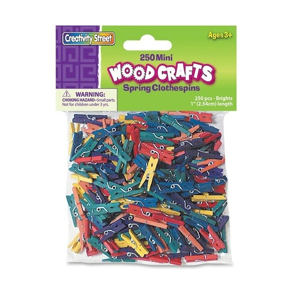 Hang art projects and more with these subtle, Mini Spring Clothespins in bright hues. Made of wood with metal springs, they have many arts and crafts applications. To use, simply press on one end and clamp your creation with the other so you can attach it to thin rods and string. Each pin is 1'' in length. Clothespins are recommended for children ages 3 and up.