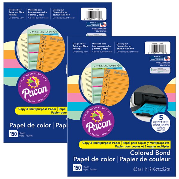 Convenient for school, home or office use. This assorted package is perfect for documents you want to stand out among the rest. Inkjet and laser printer compatible. Retail-friendly packaging! Recyclable. Measures 8-1/2" x 11". Each pack includes 150 sheets. Sold as 2 packs for a total of 300 sheets.