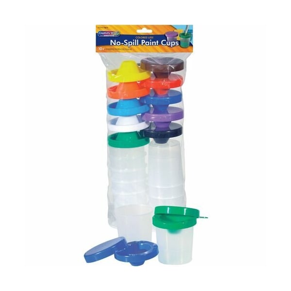 These dual-lid storage cups keep paint from spilling out. Outer lid securely seals the cup while the inner lid keeps the paint from spilling out if the cup gets knocked over. Set includes 10 round 3'' diameter cups with colored lids. Lids are 3-1/4'' diameter with 1/2'' lip for a total 3-3/4'' diameter. Color of the lid easily identifies the color of the paint inside. It also serves as a brush holder. Each cup is marked with an easy-to-read fill line. Storage cups are designed for children ages 3 and up.