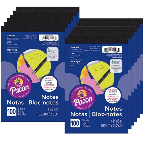 Convenient for school, home or office use. Perfect for quick notes and will fit standard size note holders. Each pad includes 100 sheets of assorted fluorescent paper. Measures 4" x 6". Sold as a pack of 12 pads.