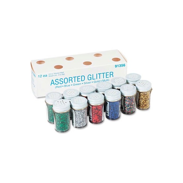 an assortment of twelve 3/4 oz. Jars of glitter with shaker tops. Two jars of each color red, green, blue, gold, silver and multi-color in a handy dispenser pack. Non-toxic and conforms to astm d-4236. this product arrives to most customers in 2-3 business days.