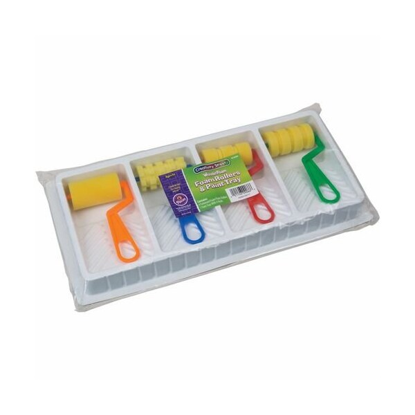 Foam rollers and paint tray let children paint in a fun and creative way. Distinctive patterns can be used to quickly paint surfaces with four unique designs. Paint tray holds four different colors and features a slanted base to remove excess paint.
