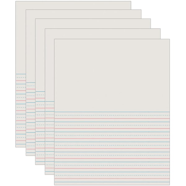 Clean White newsprint paper printed on both sides with a red baseline and a dotted blue midline, making it easy for students to find the headline quickly and easily. It's also great for tracking students' handwriting progress over time, and helps build a solid foundation for students to write legibly and communicate effectively through writing. Ruling conforms to D'NealianTM handwriting program. Package contains 500 sheets. Measures 8.5" x 11". Recyclable. Sold as a set of 5 packs, 2500 sheets total.