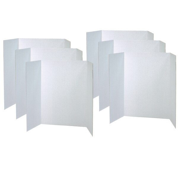 Presentation boards are tri-fold, single-wall corrugated display boards used for projects, booths, science fairs and all types of displays. Boards have a smooth, flat, uniform surface to accept many types of medium. Boards are White on the front and Natural Kraft on the back. The full display size is 48" x 36" and the board folds to 24" x 36". Recyclable. Pack of 6 boards.