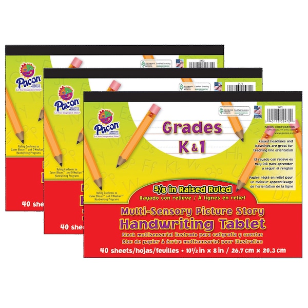 The Multi-Sensory Raised Ruled Paper has raised headlines and baselines which help students stay within the guidelines. It helps teach handwriting through two senses, sight and touch. The headlines are blue and the baselines are red. It has a 5/8" ruling, 5/16" dotted midline and 5/16" skip space and conforms to both D'NealianĀ® and Zaner-BloserTM handwriting styles. This tablet has 4.38" picture story space at the top and contains 40 sheets of paper. Recommended for Grades K and 1. Measures 10.5" x 8". Sold as a pack of 3 tablets.