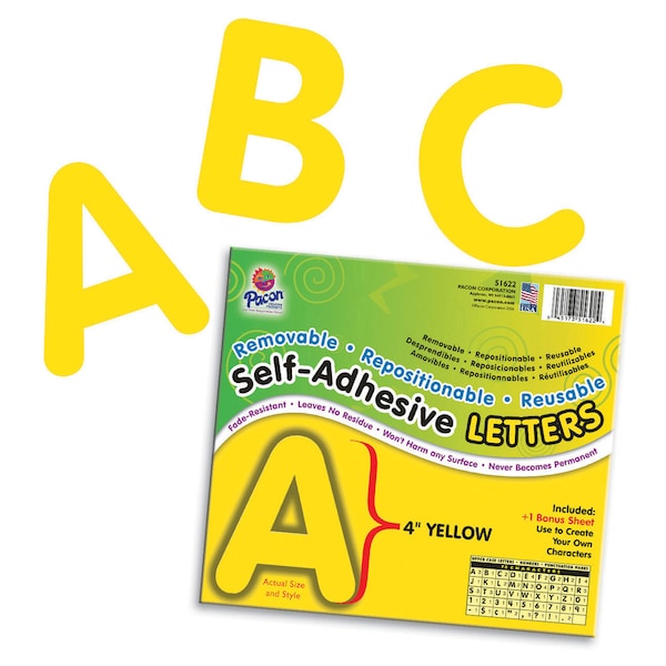 A unique adhesive makes these letters removable, repositionable and reusable. They are easy to use - just "peel and place". They adhere to any clean and dry surface that is smooth or slightly textured (even wood and painted brick walls). Fade-resistant, acid free, leaves no residue and never becomes permanent. Each package contains uppercase letters along with numbers and punctuation marks. Ideal for bulletin boards, signs, posters, presentation boards and much more. The 4" letters have 78 characters per pack. Sold as 2 packs for 156 characters total.