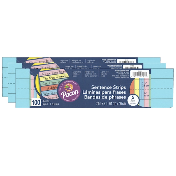 Printed on sturdy tagboard that performs well with inks, pencils and crayons. Ruled 1.5" with .75" dotted midline on one side, and a single line ruled on the opposite side. Assorted colors include Blue, Pink, Canary, Green and Orange. Measures 3" x 24". Use for teaching basic skills, word wall activities, tags and more! Includes 100 strips. Sold as 3 packs for a total of 300 sentence strips.