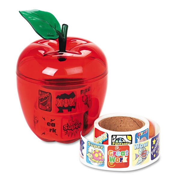 Bright, shiny red plastic apple stores three rolls of assorted message reward stickers.