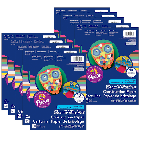 SunWorks® Heavyweight Groundwood Construction Paper provides the best value in school grade construction paper. It is the perfect solution for school projects and other arts and crafts. It has bright and consistent colors, a smooth texture and cuts and folds evenly without cracking. Recyclable. Assorted colors include: Scarlet, Black, Brown, Pink, Violet, Blue, Holiday Green, Yellow, Yellow-Orange and White. Measures 9" x 12". Includes 50 sheets. Sold as 10 packs for a total of 500 sheets.