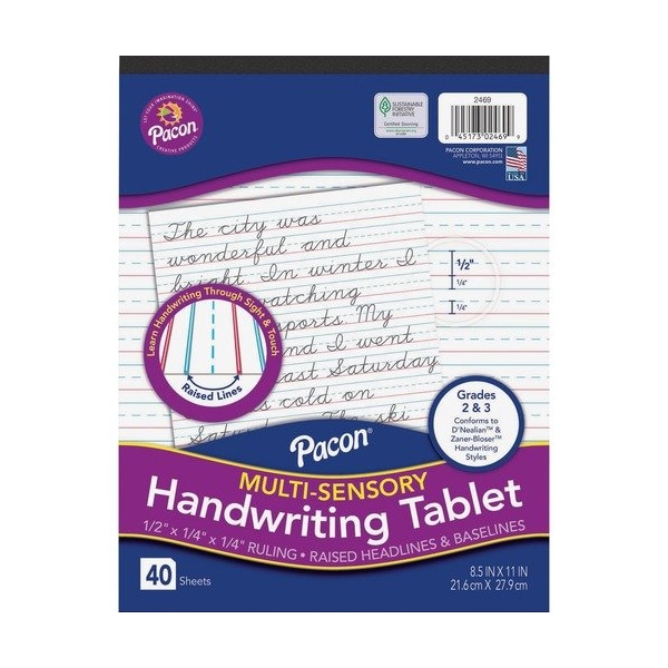 Help students learn and practice their writing skills by giving them a tablet with ruled paper that can not only be seen but felt. Raised headlines and baselines on this Multi-Sensory Handwriting Tablet give students some extra-sensorial cues to guide them in letter formation, spacing and organization. They can learn handwriting through two senses: sight and touch. This portrait-oriented tablet mimics a standard notebook, making it a great option for students who benefit from the raised ruling, but may not want to draw attention to their learning difference. Headlines are blue, and baselines are red. It has a 1/2'' ruling, 1/4'' dotted midline and 1/4'' skip space. Tablet conforms to both D'Nealian and Zaner-Bloser handwriting styles.