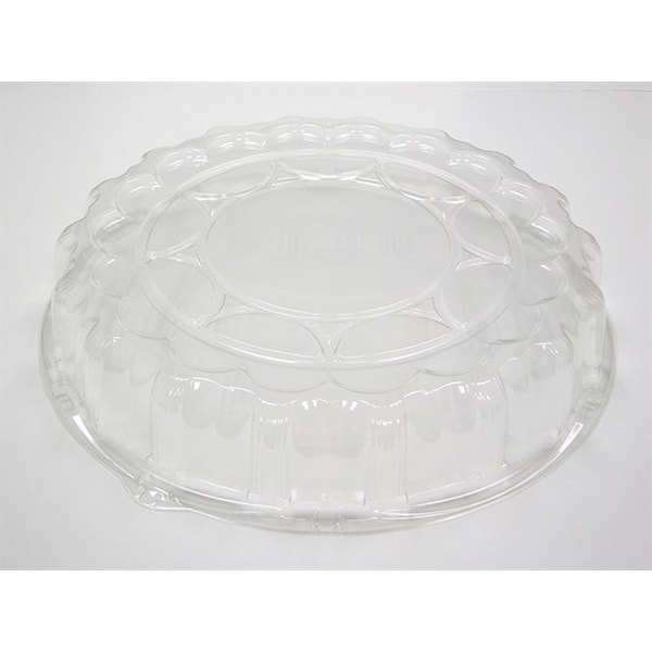 This clear dome lid is designed to fit an 18 inch plastic tray, providing a secure cover for food storage and presentation. Made from durable, transparent material, it allows full visibility of contents while protecting against contaminants. The dome shape offers extra height, accommodating larger or stacked items. Ideal for catering, food service, and event use, a pack of 50 helps maintain freshness and facilitates easy transport and display. The lid is compatible with standard 18 inch trays and is practical for both commercial and home applications.