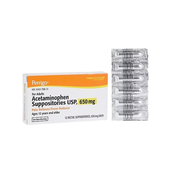 Acetaminophen Pain Reliever/Fever Reducer Suppository 650mg 12 Box, Each. Products are not always manufacturer specific. Actual product appearance may differ from website image.