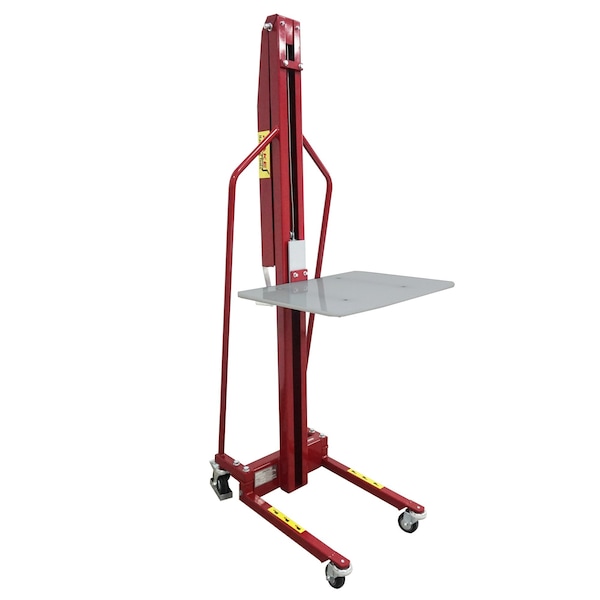 Pake Handling Tools Lightweight manual work positioner is designed to take the strain out of any lifting job. Ideal for use in narrow aisles and confined spaces. Platform height is adjustable with a manual hand winch. An auto brake system allows for controlled lowering. This lift has a load capacity of 440 lb., weighs 132 lb., and measures 76 x 24 x 28.5 inches (H x W x D). (H is height, the vertical distance from lowest to highest point; W is width, the horizontal distance from left to right; D is depth, the horizontal distance from front to back.) The platform measures 24 x 18.75 inches (W x D) and has a service range of 5.1 to 61 inches high. This product is intended for use in professional and industrial environments.