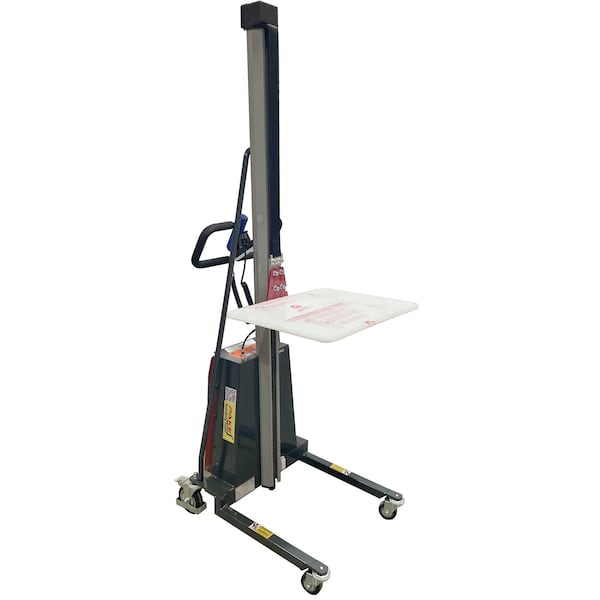 The battery-operated lift described is a lightweight and maneuverable solution designed for indoor navigating narrow aisles and confined spaces. The lift is powered by two 12V 12Ah maintenance-free batteries. These batteries provide the necessary power for the lift's operation. They are designed to be long-lasting and reliable, allowing the lift to be used approximately 80-100 times after a full charge. The batteries can be easily recharged using the included 110VAC charger. With a full charge, the lift can operate efficiently, providing lifting heights ranging from 5-1/2''. Features include push button remote control, Limit Switch, PVC Platform, Swivel Casters and Safety Belt. Loading Capacity: 330 lbs, Platform Dimensions: 23-2/3 in W x 18-1/2 in D, Lift Height Range: 5-1/2 in to 67 in, Item Weight: 146 lbs, Product Dimensions: 34-1/3 in L x 23-2/3 in W x 78-1/3 in H, Wheel Configuration: 2 5'' PU Rear Swivel with Brake; 2 3'' PU Front Swivel, Lift Control: Remote Push Button, Lift Mechanism: Chain, Frame Material: Steel Frame, PVC Platform, Batteries: 2 12V 12Ah Maintenance Free.