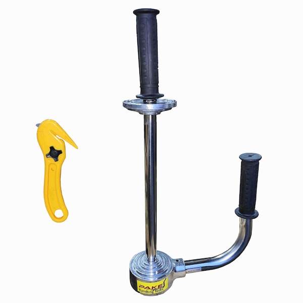 Pake Handling Tools Stretch Wrap Dispenser works with stretch films of 12'' to 20'' stretch film rolls. The package includes a film cutter.
