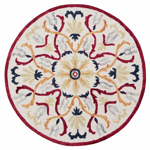 4 ft. Round Red & Ivory Floral Filigree Area Rug