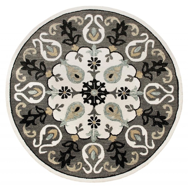 5 ft. Round Gray & White Floral Medallion Area Rug