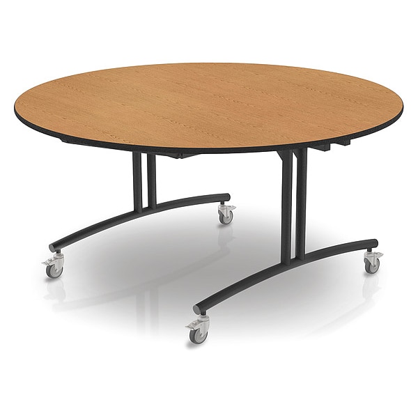 Folding Table, Surface Material High Pressure Laminate, Round, Diameter 60 in, Width 60 in, Height 30 in, Tabletop Color Family Brown, Tabletop Color Golden Oak, Frame Color Black, Assembled/Unassembled Assembled, Frame Material Steel, Edge Color Black, Edge Type EdgeGuard, PVC Edge, SmartEdge, Table Material Industrial Grade Laminated Particleboard, Top Thickness 3/4 in, Standards Not Applicable