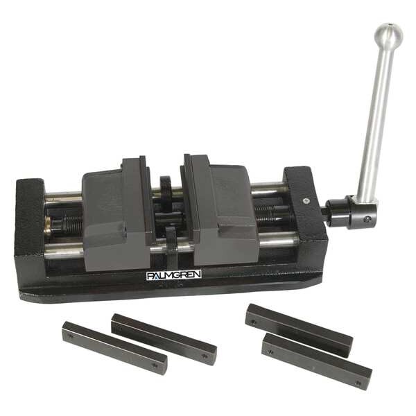 Machine Vise, Self Centering, Jaw Width (In.) 4 in, Jaw Opening (In.) 4 in, Throat Depth (In.) 3/4 in, Overall Length (In.) 11.417, Overall Height (In.) 3.346 in, Max. Travel 4 in, Cast Iron Construction with Ground Steel Guide Bars, Low Profile, Self Centering