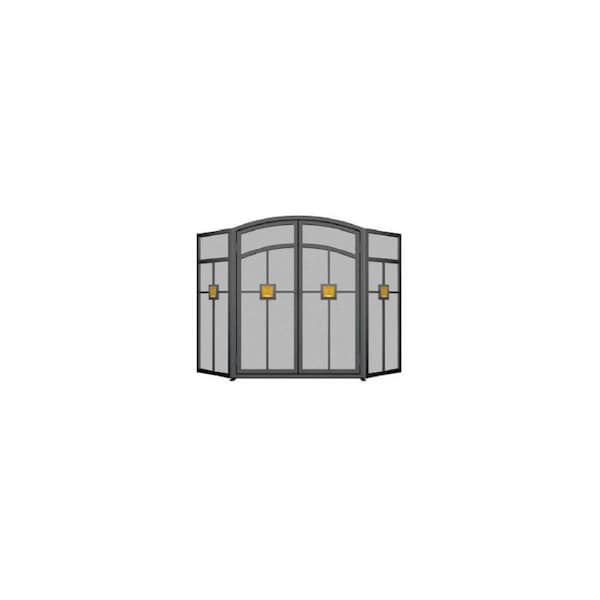 3 Panel, Eggshell Black, Mission Style 3 Panel Fireplace Screen With Doors & Amber Glass Inserts, Steel Frame & Mesh With Glass Accents, 32in H x 50in W.