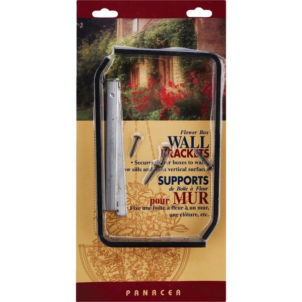 Wall mount flower box bracket made of extruded aluminum for strength. Holds most metal plastic or wooden flower boxes. For hanging flower boxes on vertical surfaces such as walls and window sills. Easy to install and will not rust. 7 In. W. x 4 In. H. Color: Black.