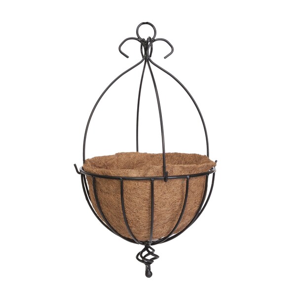 Hang your potted flowers in European style Spanish Hanging basket. Imported from Yorkshire England this basket includes handcrafted metalwork with European-styling that is simple but very rugged. A beautiful birdcage twisted steel detail finishes the underside of the basket and a thick steel clamp-on hanger with scrolls attaches to the top of the basket giving it a stately appearance. It includes a coco liner that holds over 2 gallons of soil providing generous growing space for your plants. A unique PE coating is applied to provide a soft climbing surface for vines while giving the basket a more rugged thicker appearance and weather-tight protection to prevent rust.