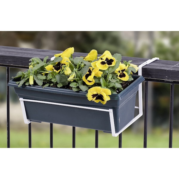 The Panacea flower pot holder holds flower pots and comes in a white finish. With a classic and elegantly designed holder used for displaying your flowers and plants, you can enhance any deck or porch railing.