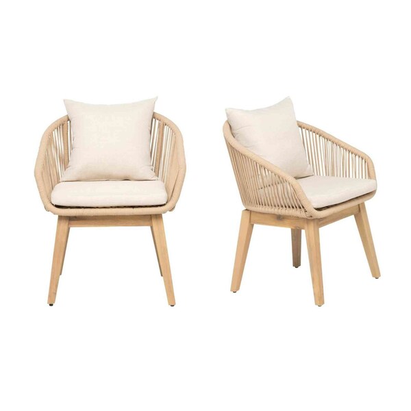 Elevate your outdoor dining experience with the Panama Jack Set of 2 Cabo Dining Armchairs. Crafted meticulously from solid Acacia wood, these chairs boast a rich honey-hued finish, marrying elegance with durability. Each chair is accentuated with modern tan cording along its profile, presenting a blend of contemporary design and classic craftsmanship. The seats are dressed in a 100% polyester fabric that's both comfortable and quick-drying, making them suitable for all weather conditions. For those aiming for a unique aesthetic, Sunbrella fabric options are available. To retain the lustrous golden teak glow of the Acacia wood, it's advised to perform light sanding and apply teak oil periodically. Dive into a dining experience that's a fusion of style and resilience with the Cabo collection from Panama Jack.