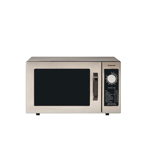 This Panasonic Pro Light Duty Commercial Microwave Oven NE-1025F is ideal for quick heating jobs with its simple controls and 6-minute dial timer. The Panasonic NE-1025 features a bottom-fed energy system, instead of side or top energy feed, for improved efficiency since heat energy doesnt have to travel as far to reach the microwaves contents. This compact Commercial Microwave Oven has a 0.8 cubic feet oven cavity which can accommodate one half-size steam table pan up to six inches tall and its lid. For your low volume microwaving needs, it doesnt get any simpler than this Commercial Microwave Oven from Panasonic. FEATURES: 0.8 cuft Commercial Microwave for high efficent, high-quality food preparation. 1000 Watts of hi-power, Auto Reset 6-Minute Electric dial timer, Grab & Go Door Handle that is fast and durable, NSF and UL Commercial approved, Fits 1 half-size, 6" deep steamable pan/cover in flat interior, Cord length is 5'-5", See-thru oven door and anti-theft equipped, Required power 13.4A, 120V, 60Hz, Cavity size: 13"x13"x8.1" (wxdxh). Stainless Steel