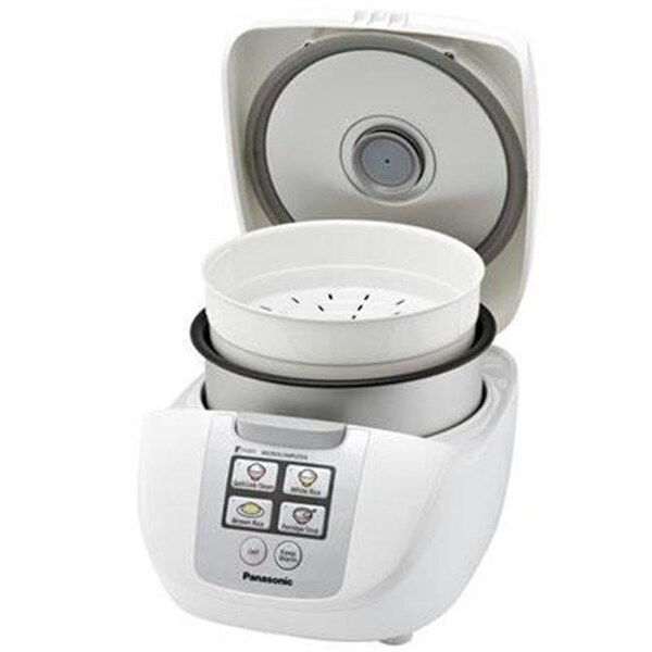 Panasonic Microcomputer Fuzzy Logic 5 Cup Rice Cooker - 5 Cups Uncooked Rice. Micro-computer controlled with Fuzzy Logic. Easy One-Push Operation. Visible Big Slant Panel. 6 Menu Settings - Quick Cook/Steam, White Rice, Brown Rice, Porridge/Soup. Compact Body. Detachable Cord. Multi-Lingual Instructsions (English, French, Chinese, Spanish, Korean). Fixed Inner Lid. Steaming Basket. Also includes m