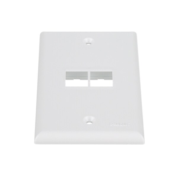 The NetKey Faceplate accepts two keystone modules. The faceplate is single gang and mounts to a NEMA standard single gang opening. The faceplate can be identified with an adhesive label and is white.