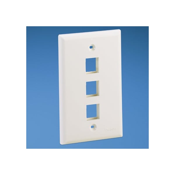 The NetKey Faceplate accepts three keystone modules. The faceplate is single gang and mounts to a NEMA standard single gang opening. The faceplate can be identified with an adhesive label, and is white.