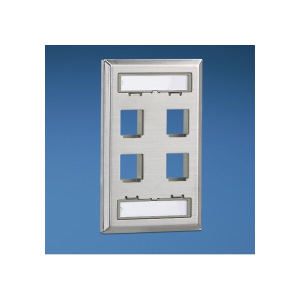 The NetKey Faceplate accepts four keystone modules. The faceplate is single gang, includes label and label cover, and is stainless steel.