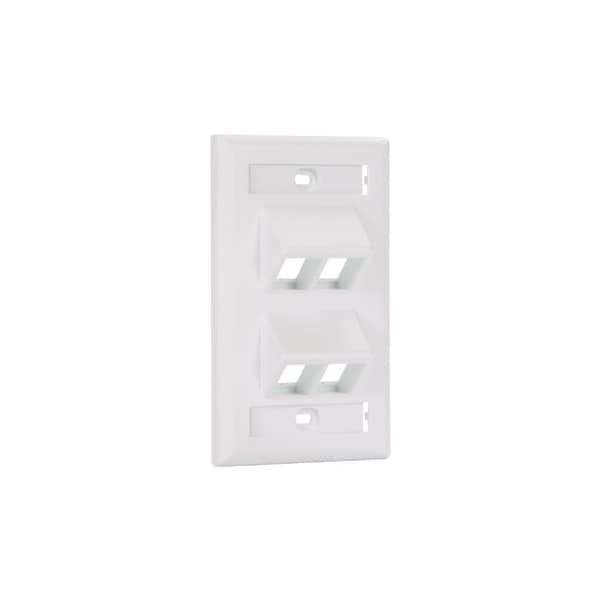 The NetKey Faceplate accepts four keystone modules. The faceplate is single gang and mounts vertically to a NEMA standard single gang opening. The faceplate includes a label pocket for easy identification and is white.
