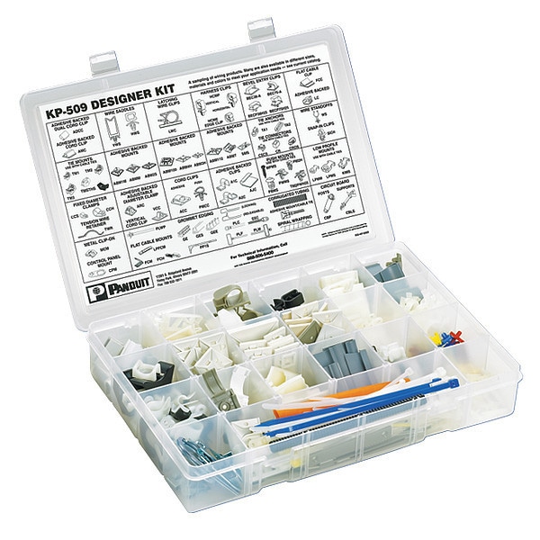 Cable tie and accessory kit for indoor use contains Pan-Ty® Cable Ties in different styles, sizes, and colors and huge assortment of cable tie mounts and wiring accessories. Over 600 pieces for prototyping and new product development in a sturdy plastic kit box.