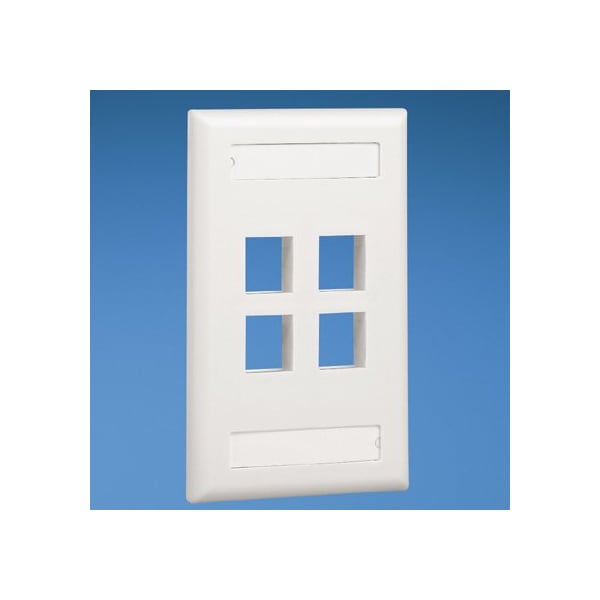 The NetKey Faceplate accepts four keystone modules. The faceplate is single gang and mounts to a NEMA standard single gang opening. The faceplate includes label and label cover, and is black.